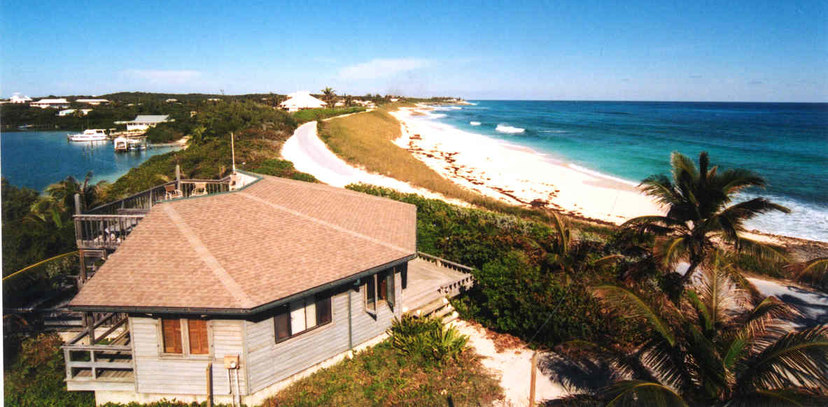Let me introduce you to Seascape House, a new adventure in island living. Situated on a ridge, Seascape offers the best of both worlds: a breathtaking view of White Sound Bay and the Sea of Abaco from its spacious rear deck and the roar of the ocean waves as seen in this video taken from the top deck and posted on You Tube. This dual frontage is unique on the island and only shared with two other houses. Have a look at a picture of a birds eye view to get a better idea of the area and the location. This page also has information on things to do and how to get there. For a web cam view of White Sound to the rear of Seascape using the web cam at the Abaco Inn fust 300 feet tho the south of Seascape try this link.